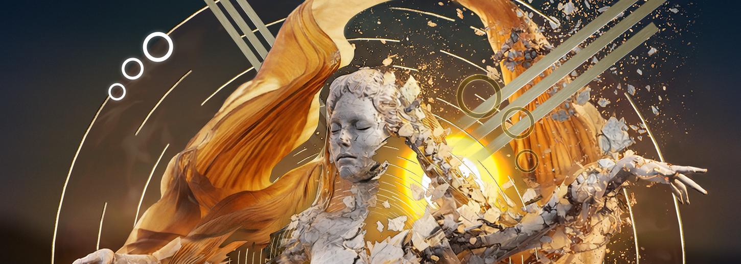 The statue, an emblem of what for centuries has represented beauty, harmony, and virtue, crumbles into particles, as if matter itself can no longer sustain the loss of empathy, respect, love, and collective awareness. The flowing golden drapery contrasts with the fragmentation of the body, creating a visual tension between what once was and what is now becoming.